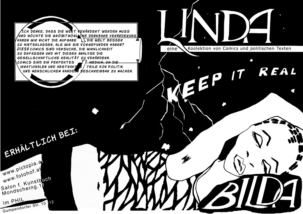 LINDA BILDA: Künstlerin und Erfinderin, lebt und arbeitet in Wien, Ausstellungsteilnahme, zuletzt: “it's the poltical economy, stupid" cur. Oliver Ressler and Gregory Sholette, ACF NY und Centre of Contemporary Art, Thessaloniki,2012, “Beziehungsarbeit", Künstlerhaus Wien, cur. Martin Fritz, u.a.m. 2009 Ausstellung im Salzburger Kunstverein “Zukunft und Ende der goldenen Welt" cur. Hemma Schmutz; Herausgabe von Comics und Zeitschriften
